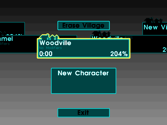 This picture is less exciting, but it's the Char Select screen, where you can make and delete new villages and characters, and swap between them to decide what you want to play right now.